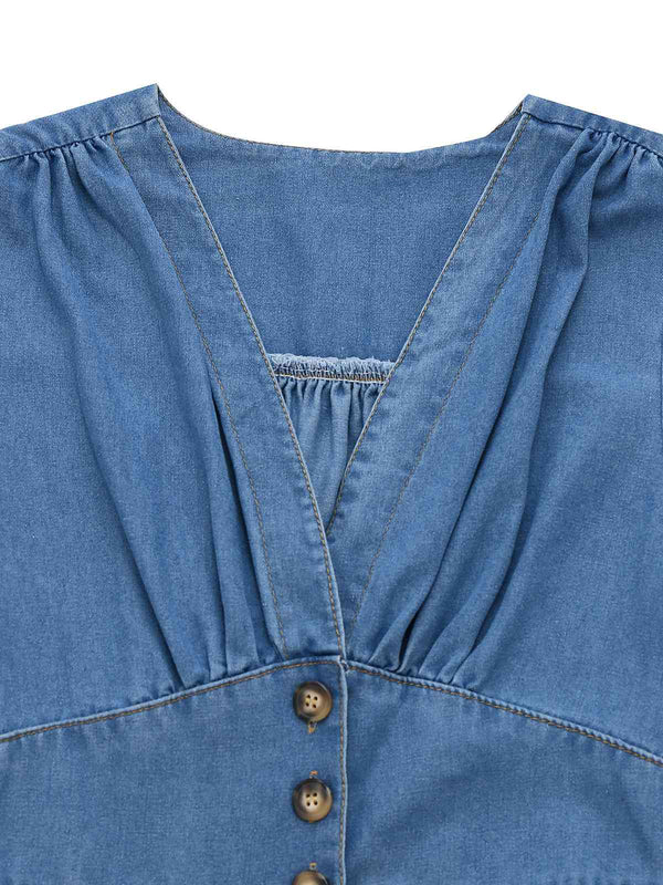 Blau 1940er V-Ausschnitt Knotenmanschette Denim Kleid