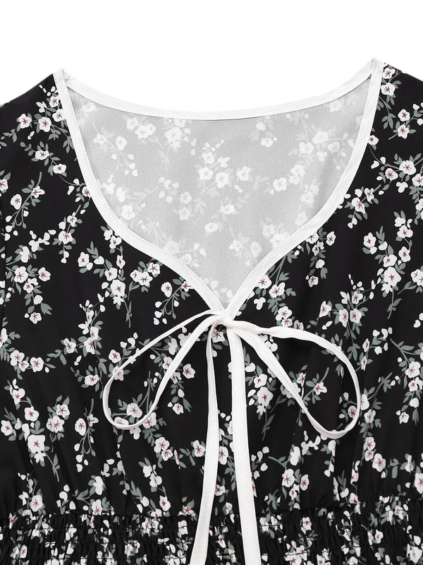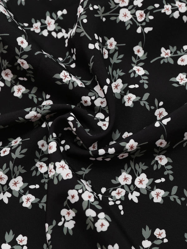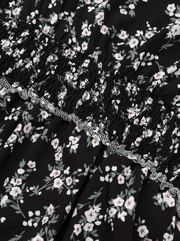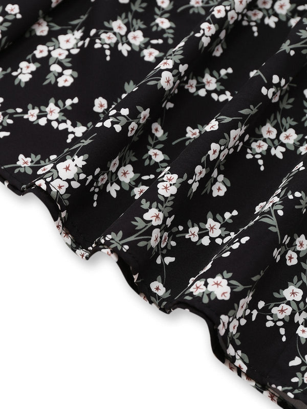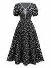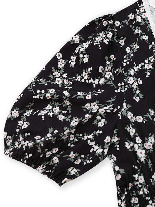 Schwarz 1940er V-Ausschnitt Puffärmel Kleine Blumen Kleid