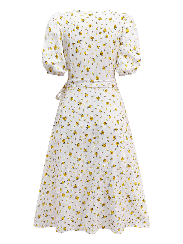 Weiß 1940er Kleine Blumen Baumwolle Wickel Kleid