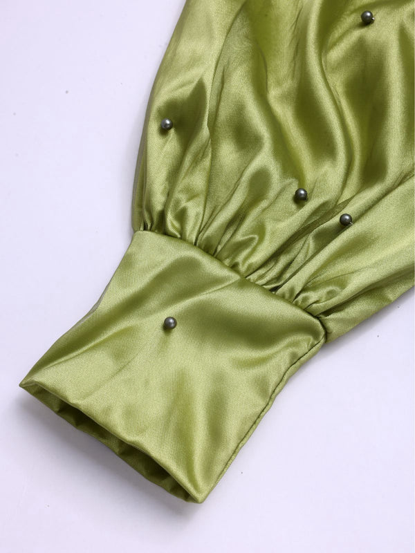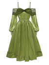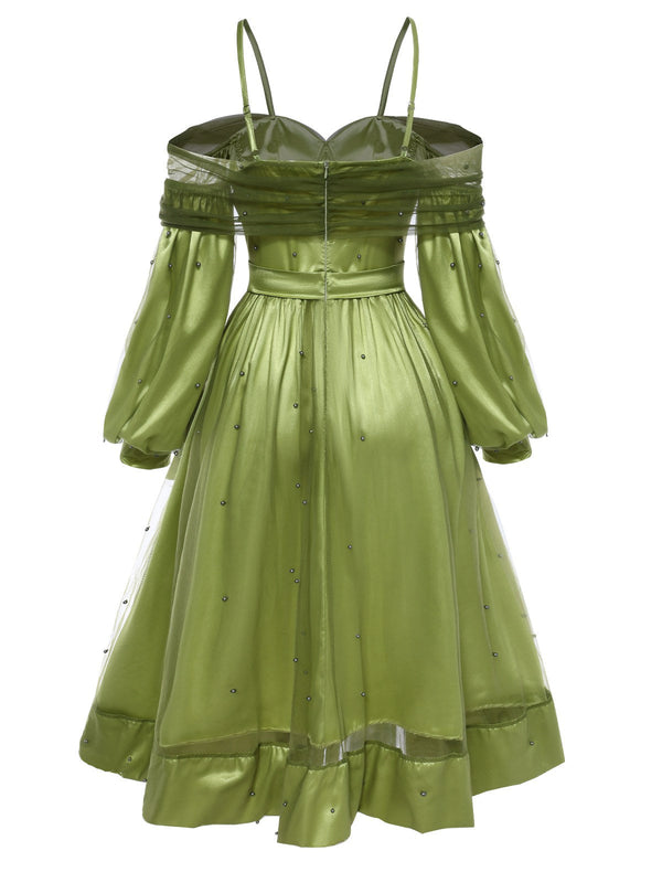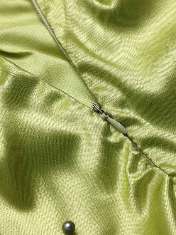 Chartreuse 1950er Perle Netz Patchwork Satin Kleid