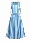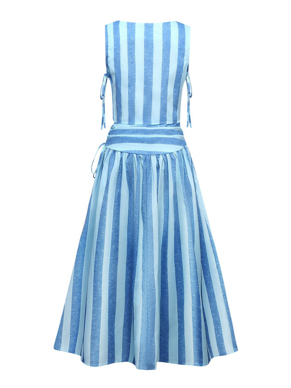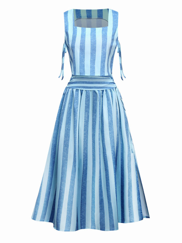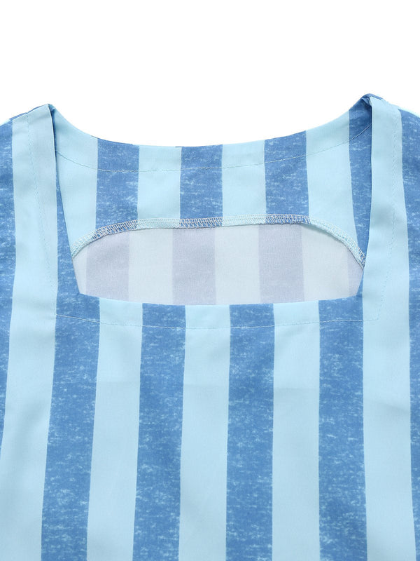 2PCS Blau 1950er Streifen Quadratischer Hals Top & Gerüschtes Rock