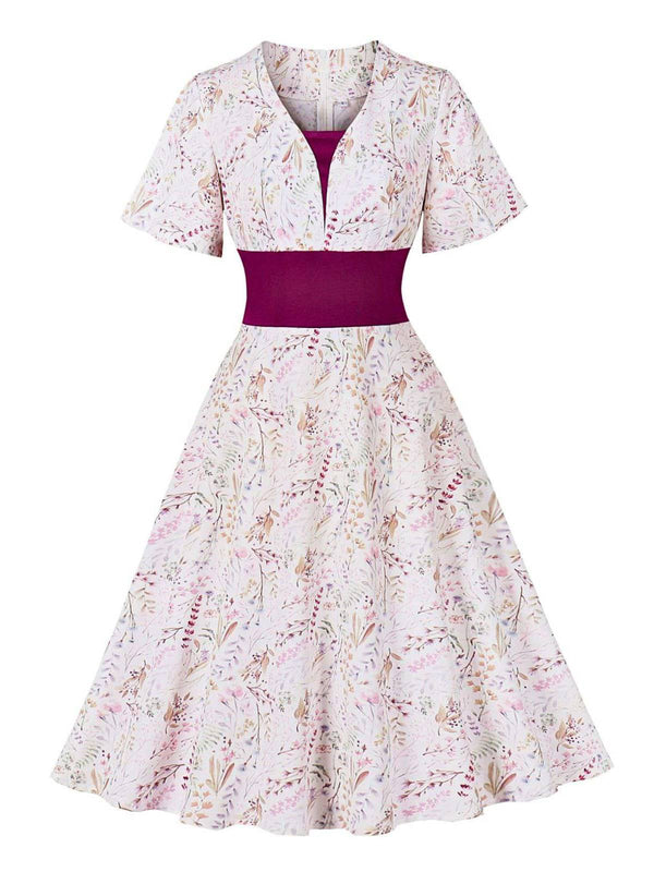 Rosaviolett 1950er Herzförmiger Glockenärmel Blumen Kleid