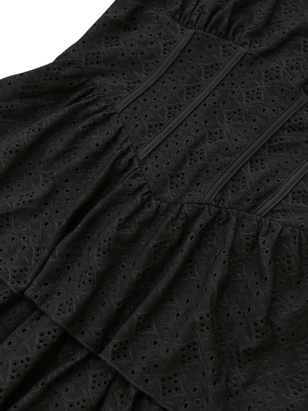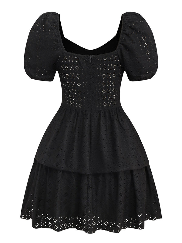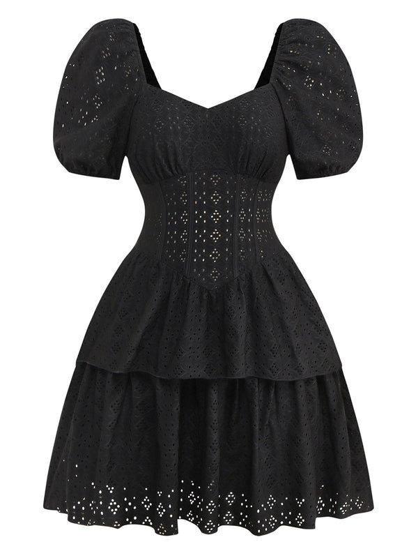 Schwarz 1950er Solide Puffärmel Korsett Hohl Stricken Kleid