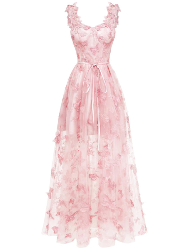 1930er Spaghetti Träger 3D Schmetterlinge Netz Maxi Kleid