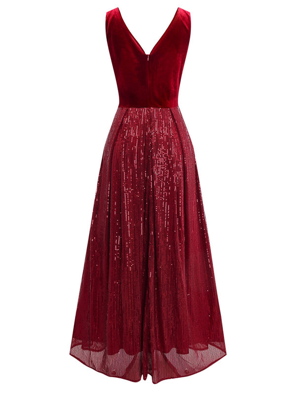 Burgunderrot 1950er Samt Pailletten V-Ausschnitt Maxi Kleid