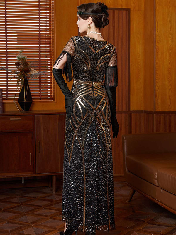 Gold 1920er Pailletten Quaste V-Ausschnitt Maxi Kleid