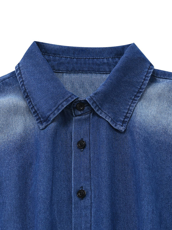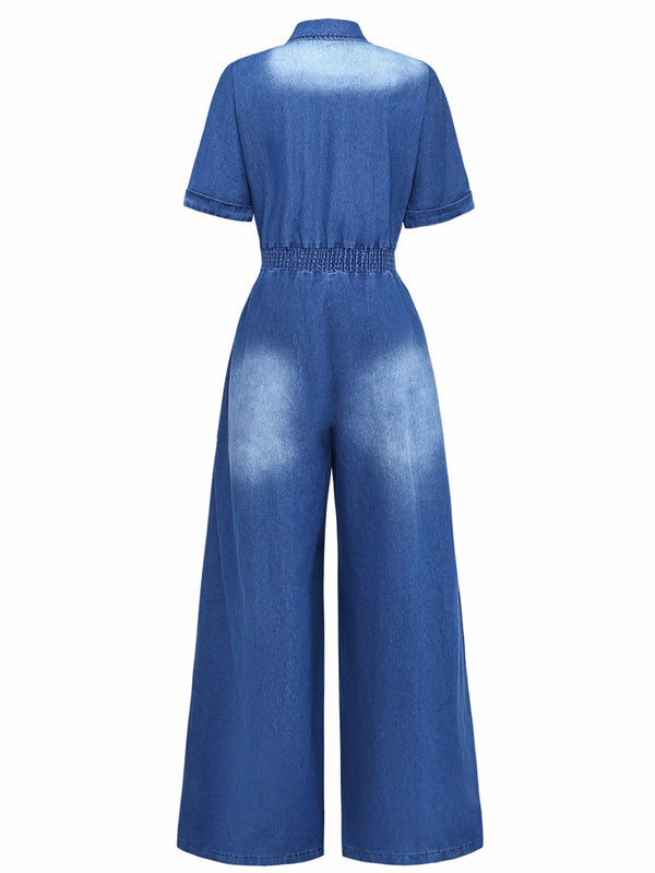 Denim 1970er Revers Knöpfe Gürtel Taille Jumpsuit