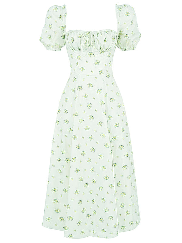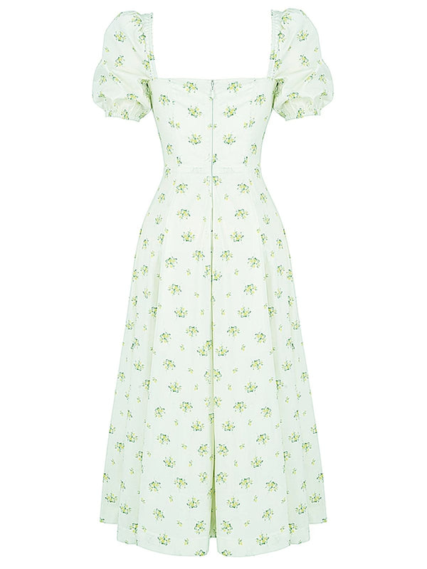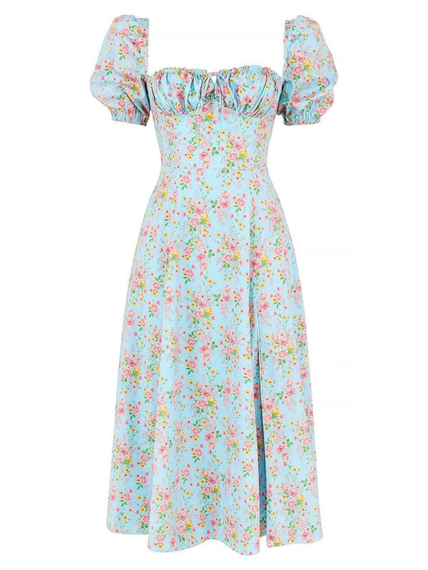 1940er Kleine Blumen Quadratischer Hals Schlitz Kleid
