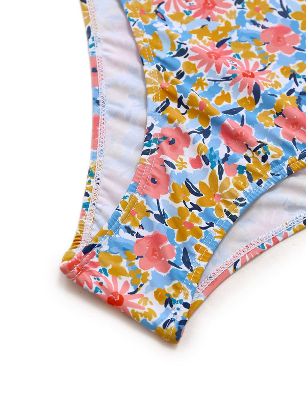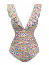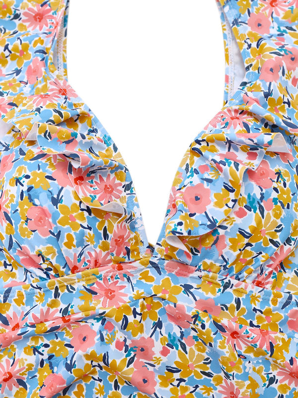 1950er Rüschen Kleine Blumen Tief V-Ausschnitt Badeanzug