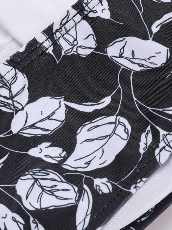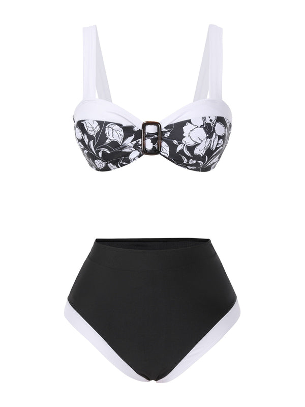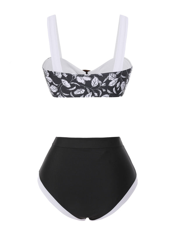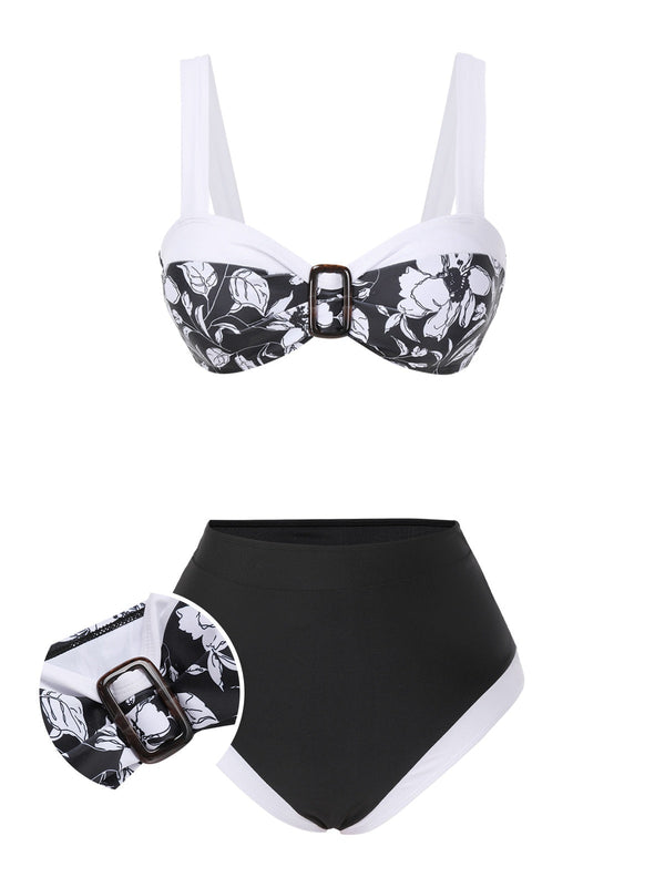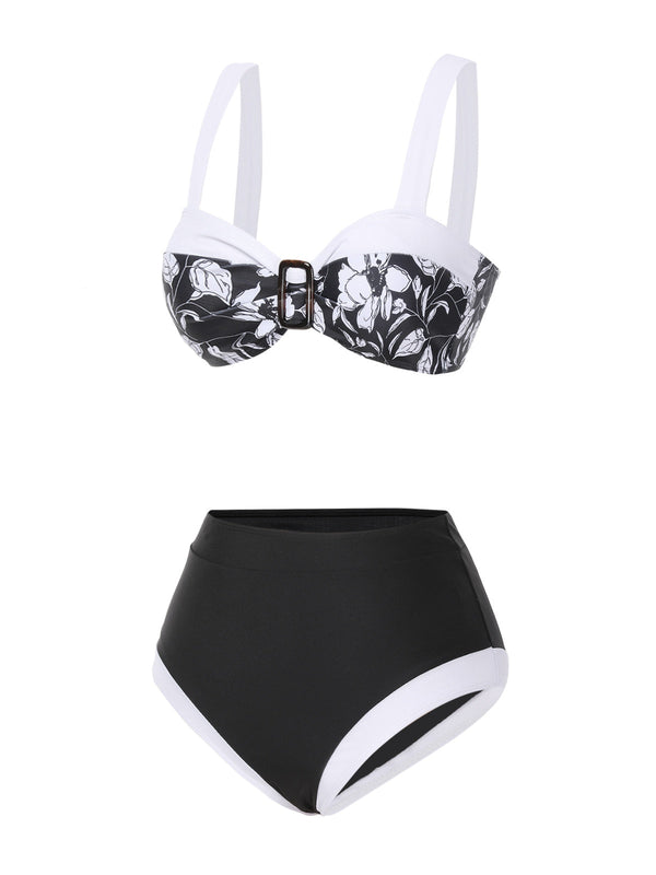 Schwarz 1940er Hepburn Silhouette Blumen Bikini Set
