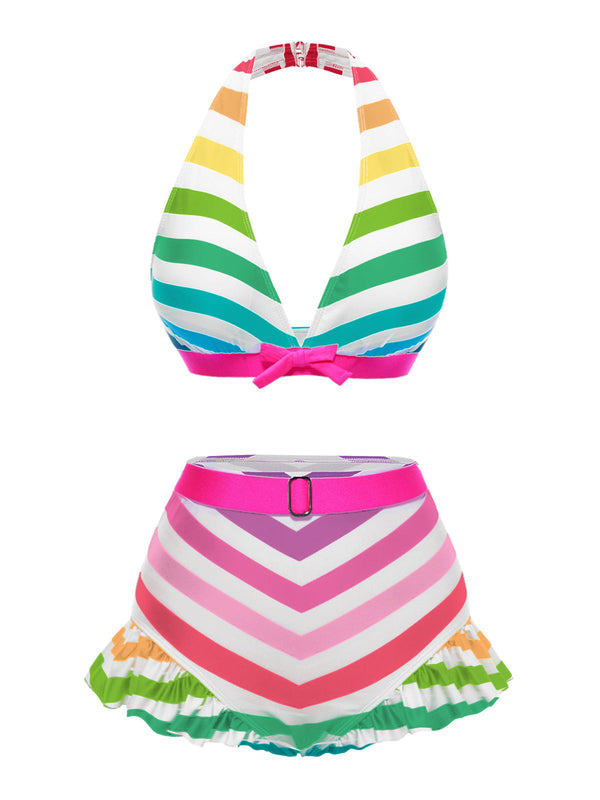 Schwarz 1950er Kontrast Bogen Rüschen Streifen Bikini