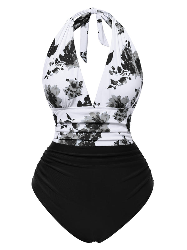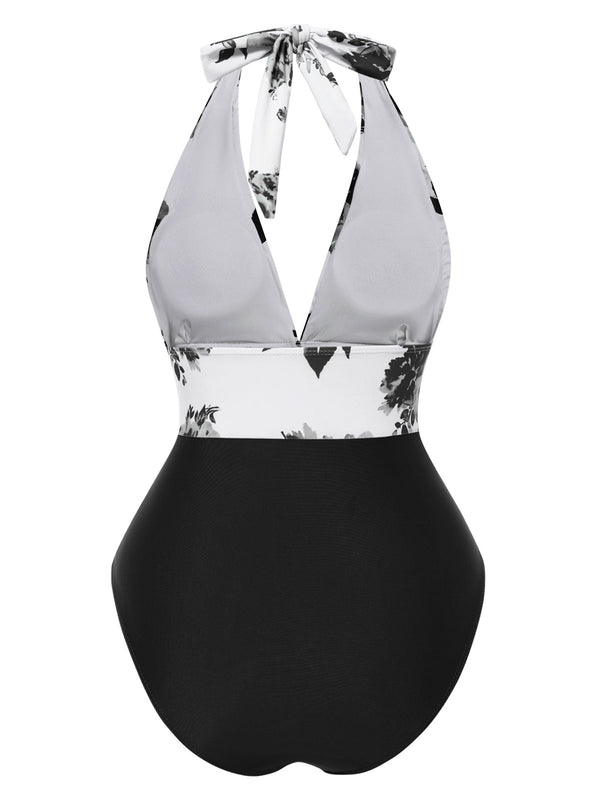 1940er Leaf Drucken Halfter Patchwork Badeanzug