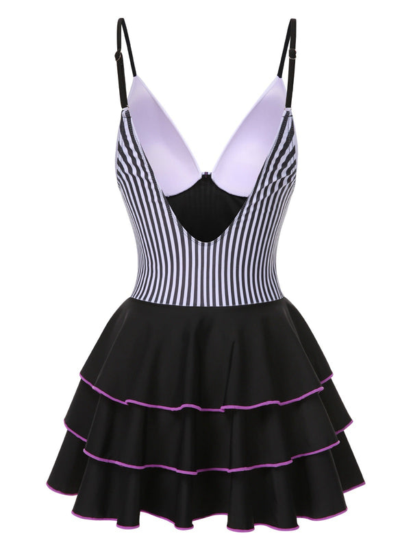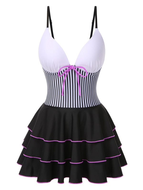 1940er Streifen Patchwork Mehrlagiger Saum Swim Kleid