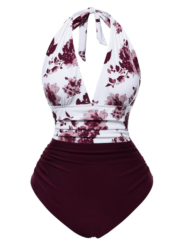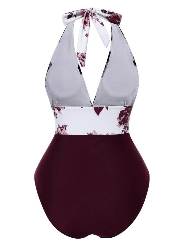 Weinrot 1940er Leaf Drucken Halfter Patchwork Badeanzug