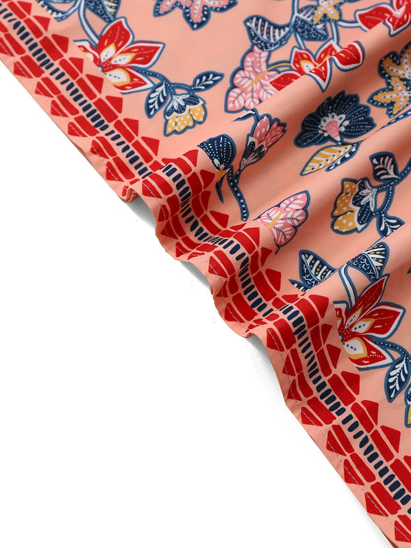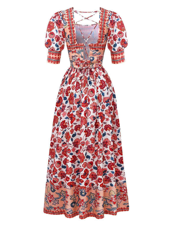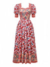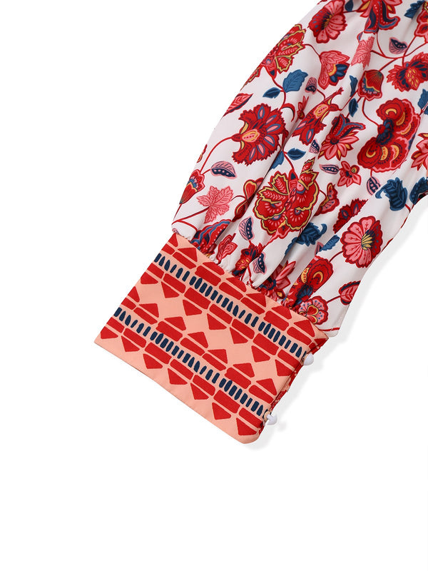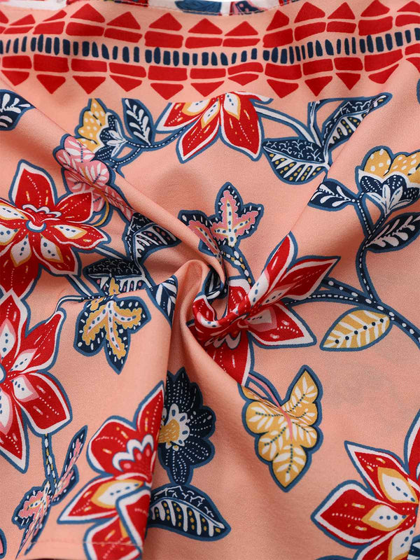 2PCS Rot 1930er Blumen Laternenärmel Ausgeschnitten Top & Gerüschtes Rock