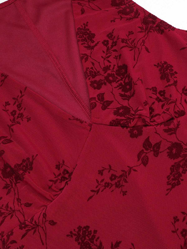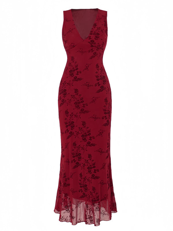 Weinrot 1930er V-Ausschnitt Blumen Netz Kleid