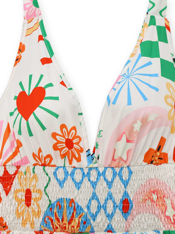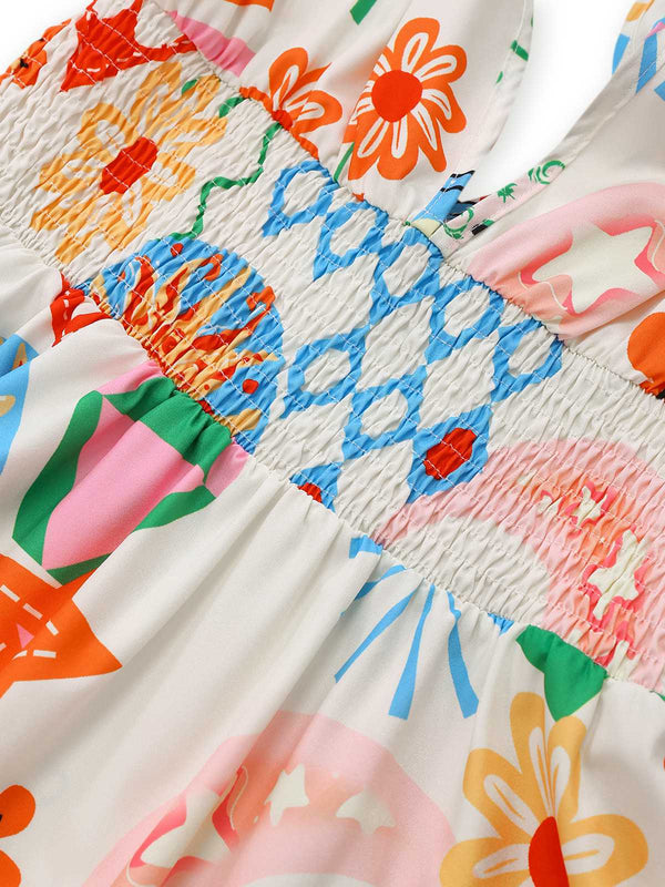 1970er V-Ausschnitt Boho Gesmokt Ärmellos Kleid