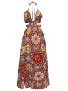 Multicolor 1970er Blumen Bohemien Halter Kleid