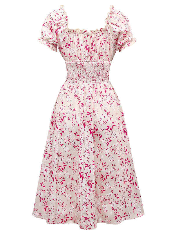 Rosa 1940er V-Ausschnitt Blumen Puffärmel Kleid