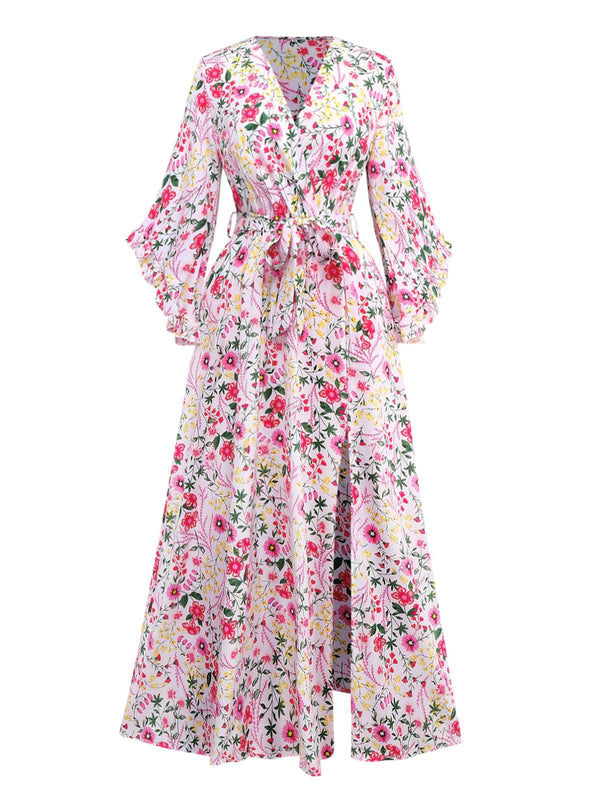 Rosa 1940er Volantärmel V-Ausschnitt Blumen Kleid