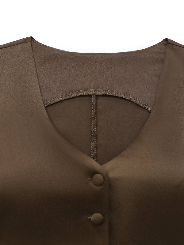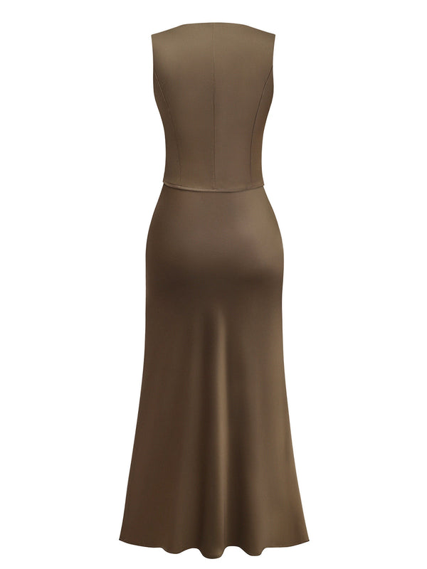 2PCS Braun 1930er Solide Satin Ärmellos Weste & Fischschwanz Rock
