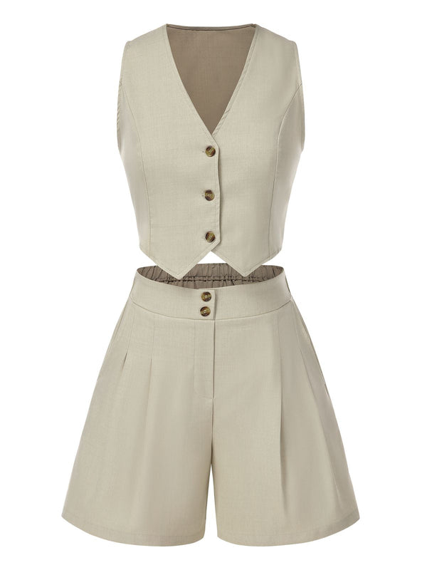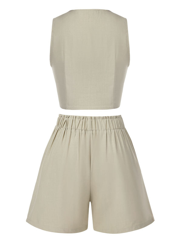 2PCS Helles Khaki 1950er Solide V-Ausschnitt Weste & Shorts