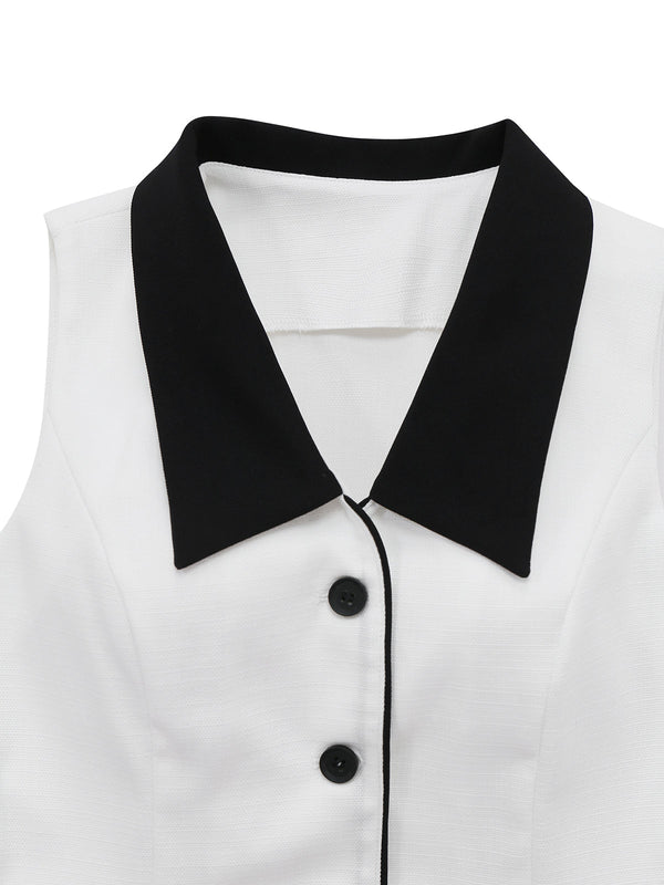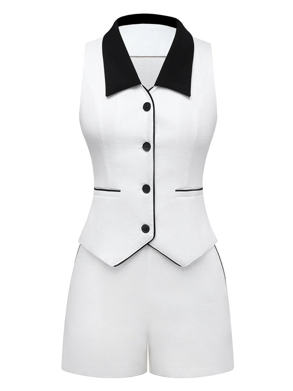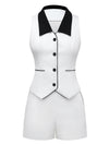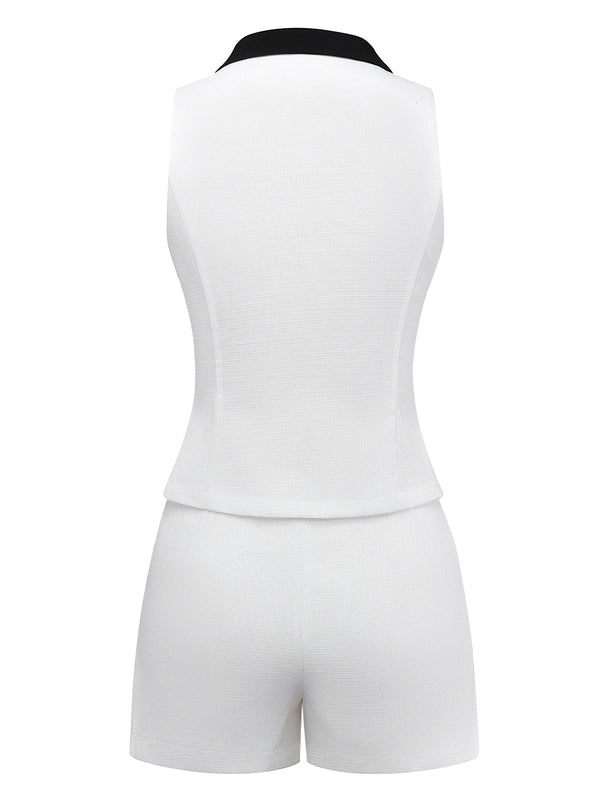 2PCS Weiß 1960er Revers Kragen Taste Ärmellos Top & Shorts