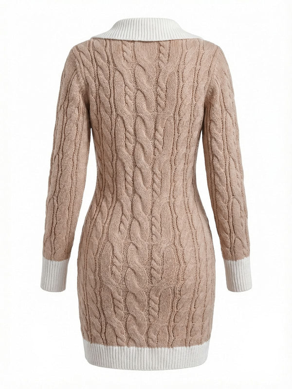 Beige 1960er Zopfmuster V-Ausschnitt Gestrickt Pullover Enges Kleid