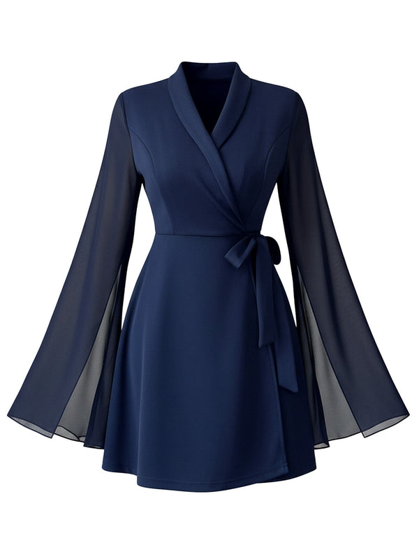 Blau 1980er Solide Schlitz Netz Ärmel Bogen Revers Kleid