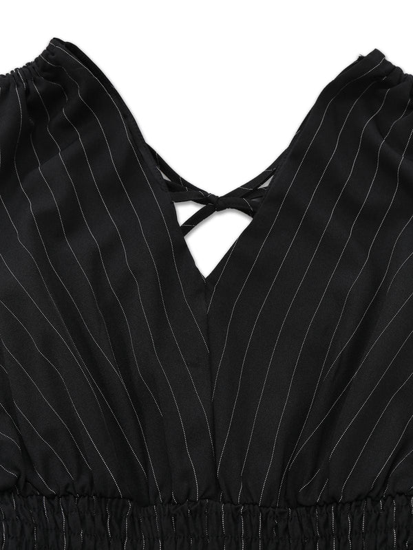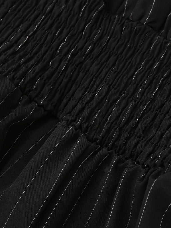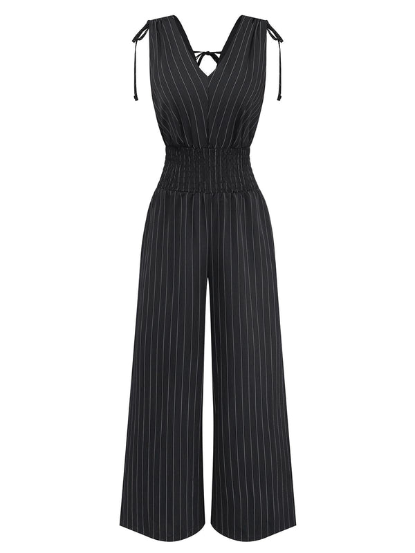Schwarz 1950er Streifen Schulter-Bindung Gesmokt Taille Jumpsuit