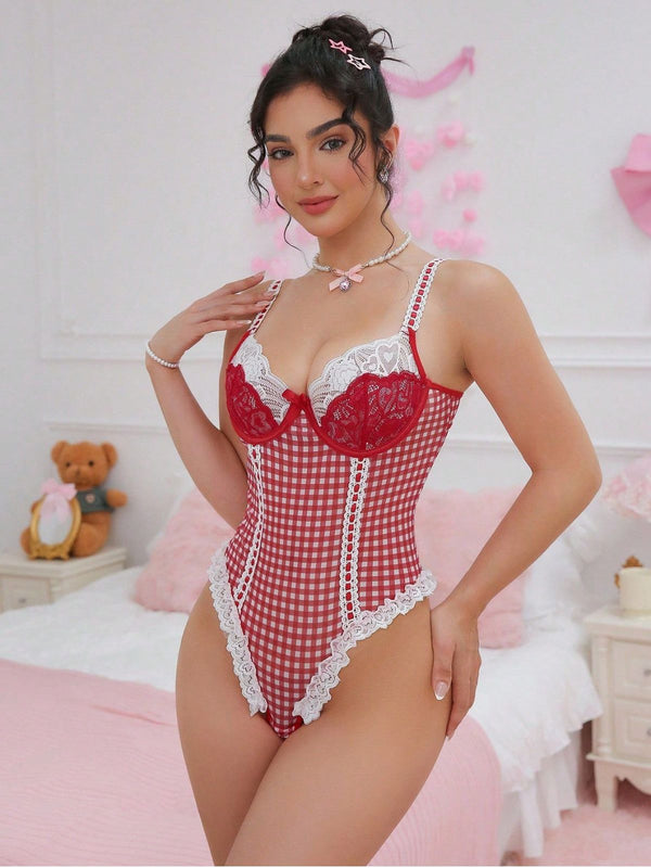 Rot 1960er Vichy-Karo Spitze Bogen Body Unterwäsche