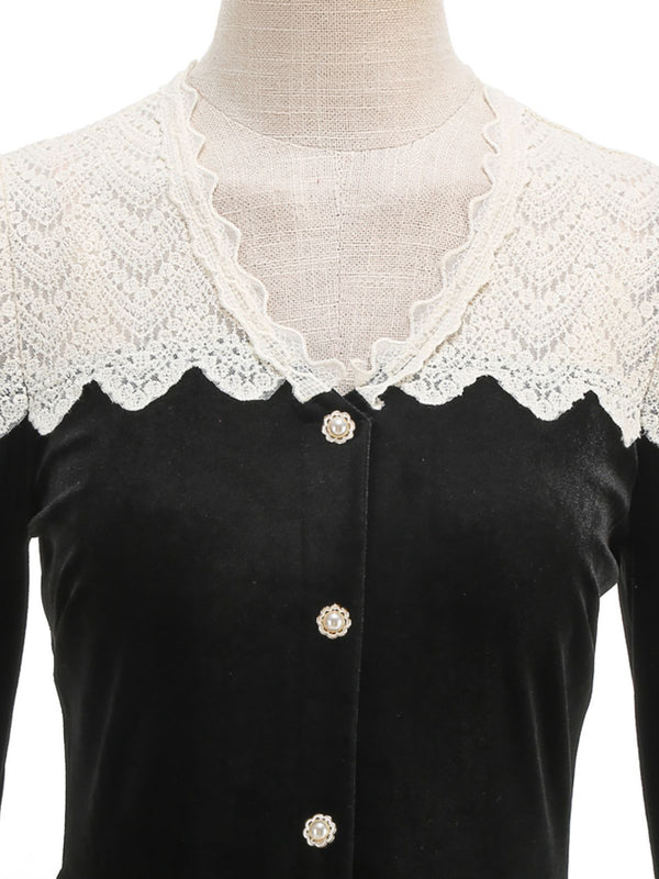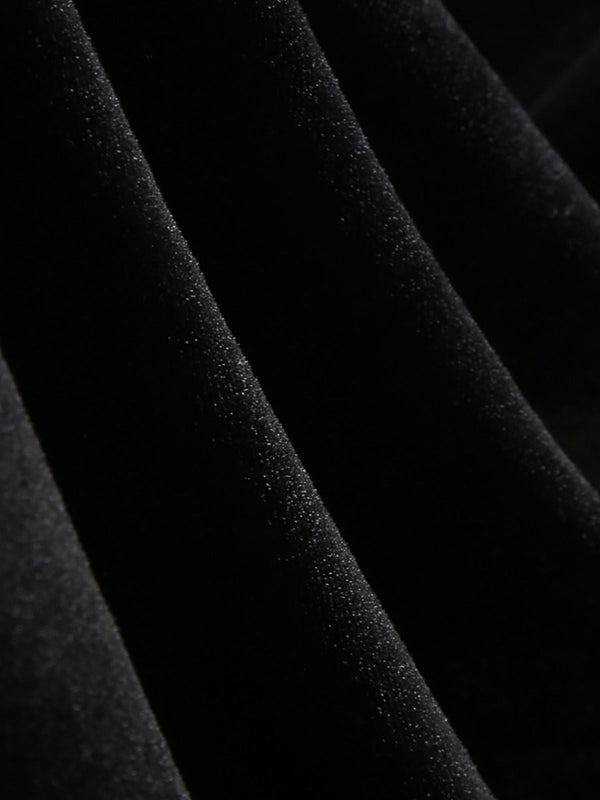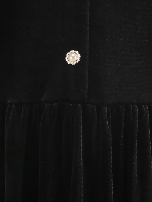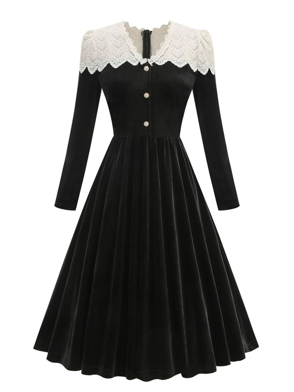 Schwarz 1950er Samt Stricken Kragen Perle Taste Kleid