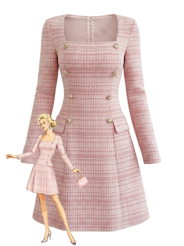Rosa 1960er Kariert Tweed Geknöpft Quadratischer Hals Kleid