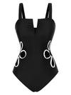 Schwarz 1950er Weiß Blumen Hohl Einteiliger Badeanzug