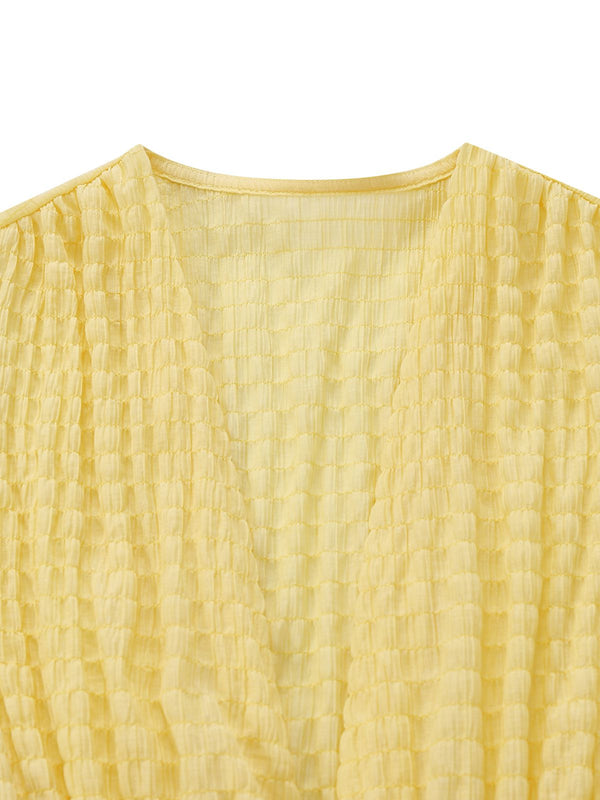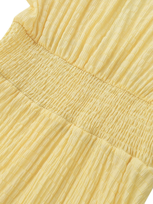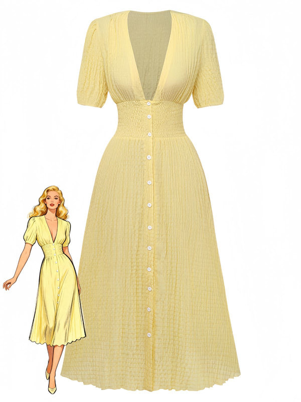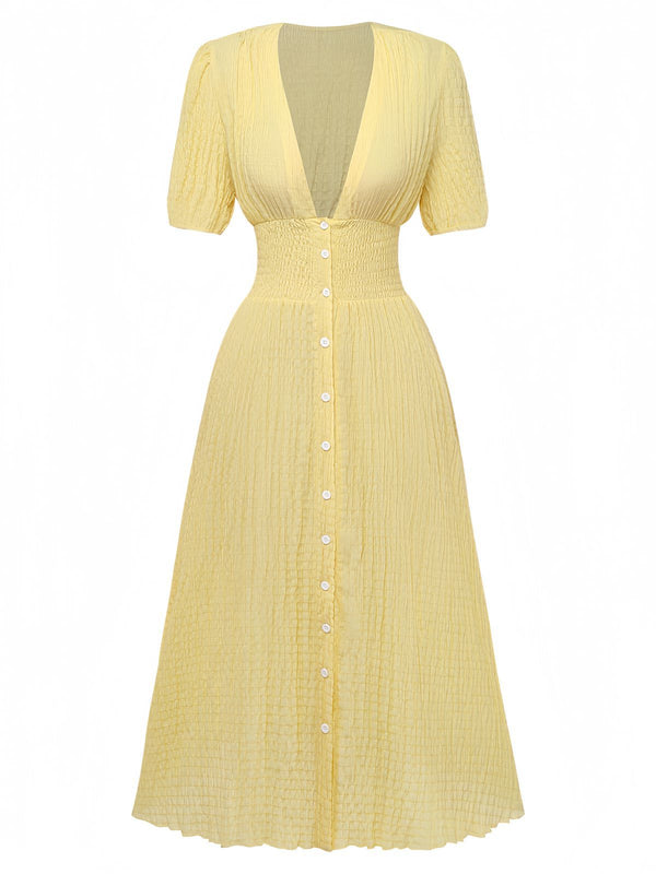 Gelb 1940er Puffärmel Durchgeknöpft Midi Kleid