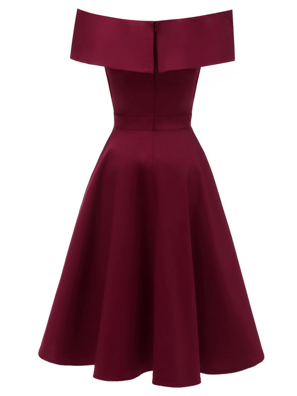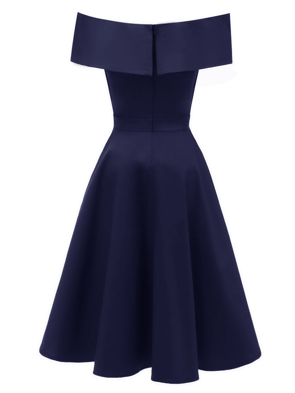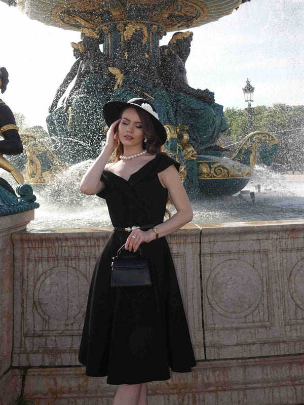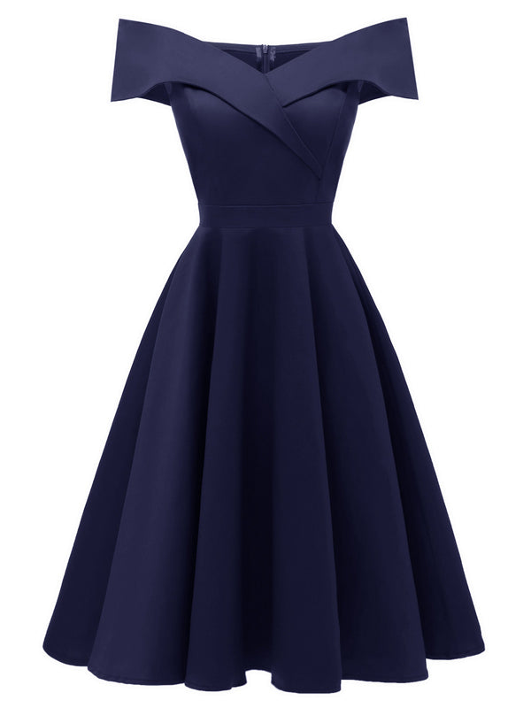 Schwarz 1950er Schulterfrei V-Ausschnitt Solide Swing Kleid