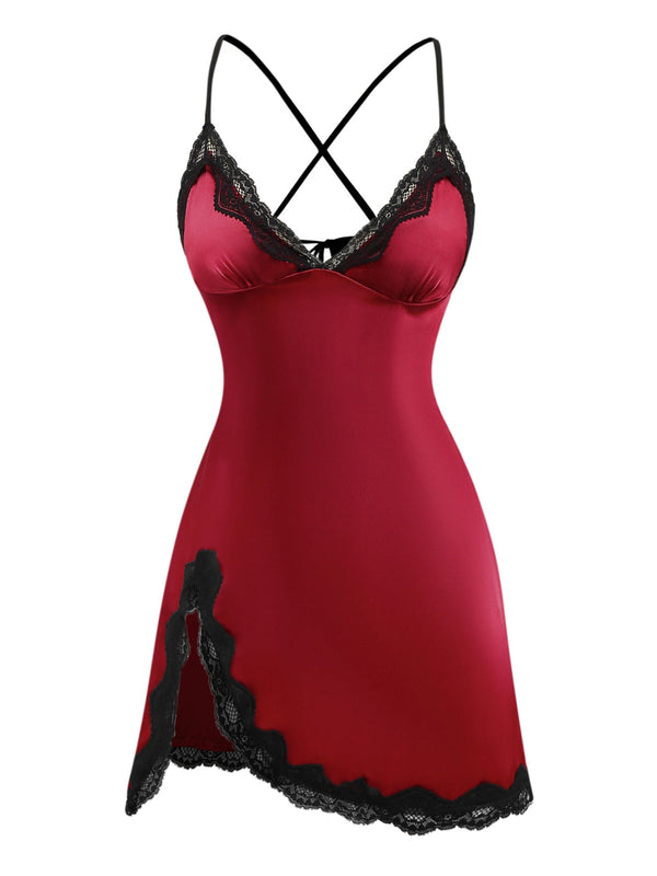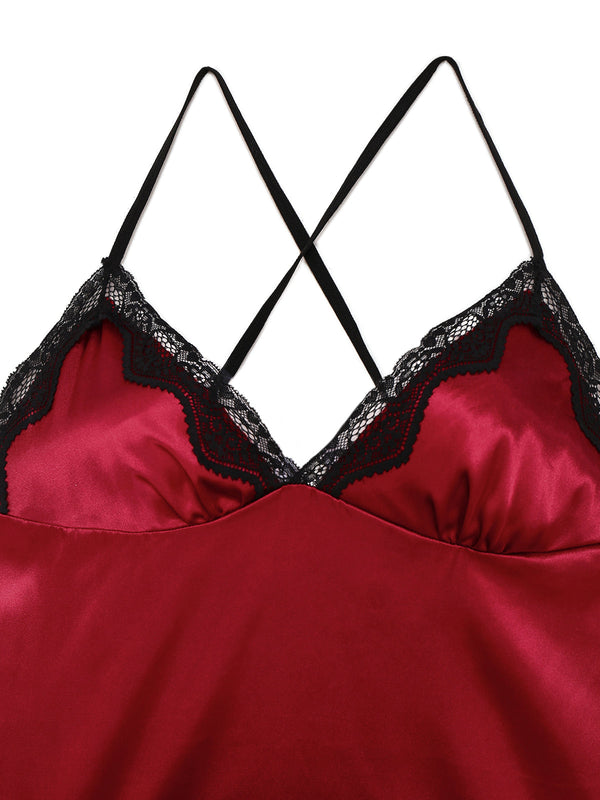 Weinrot 1950er Träger Spitze Bogen Nachthemd