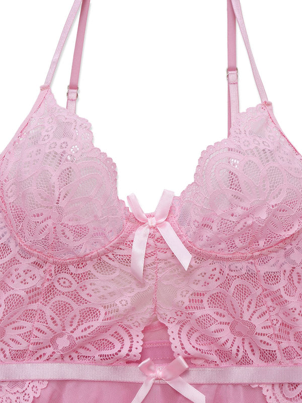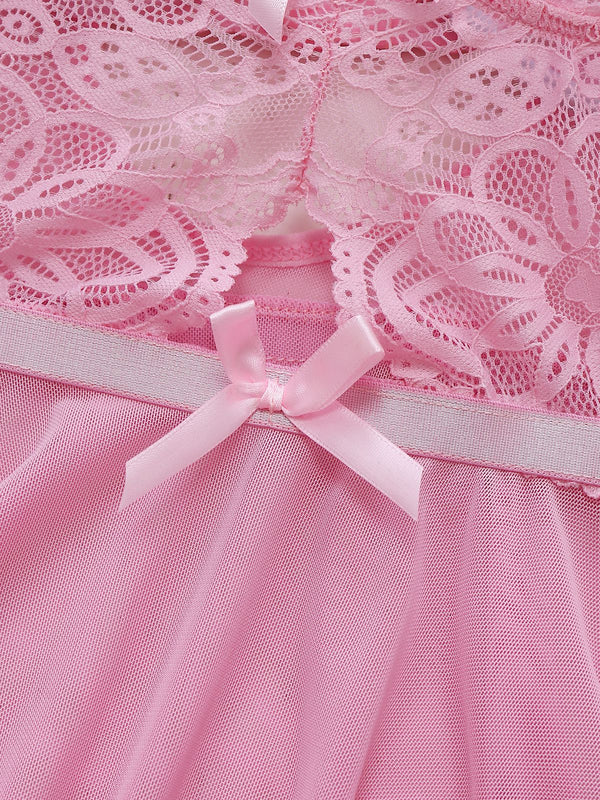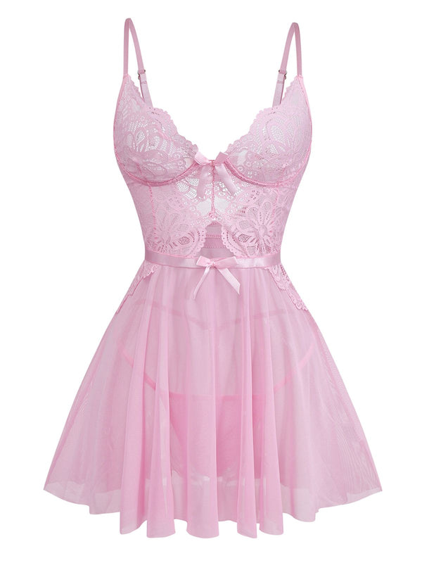 Rosa 1950er Spitze Spaghetti Träger Bogen Nachthemd