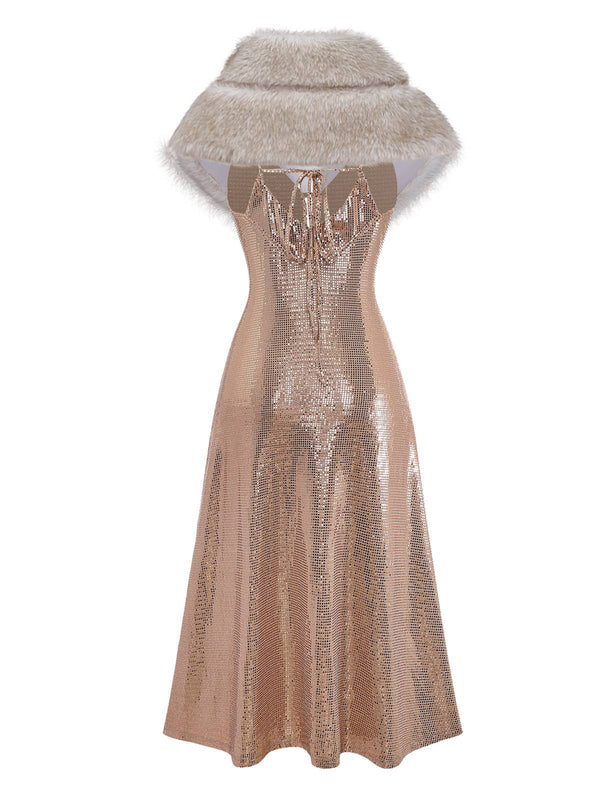 [Vorverkauf] 2PCS Braun 1920er Pailletten Kleid & Kunst Pelz Schal