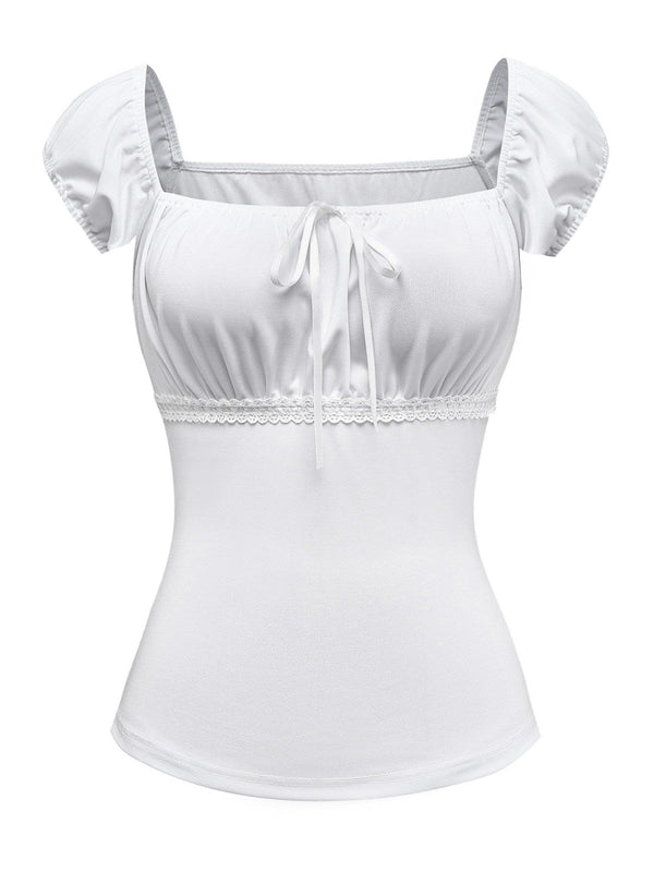 [Vorverkauf] 2PCS Weiß 1940er Spitze Gerafft Top & Denim Bogen Rock