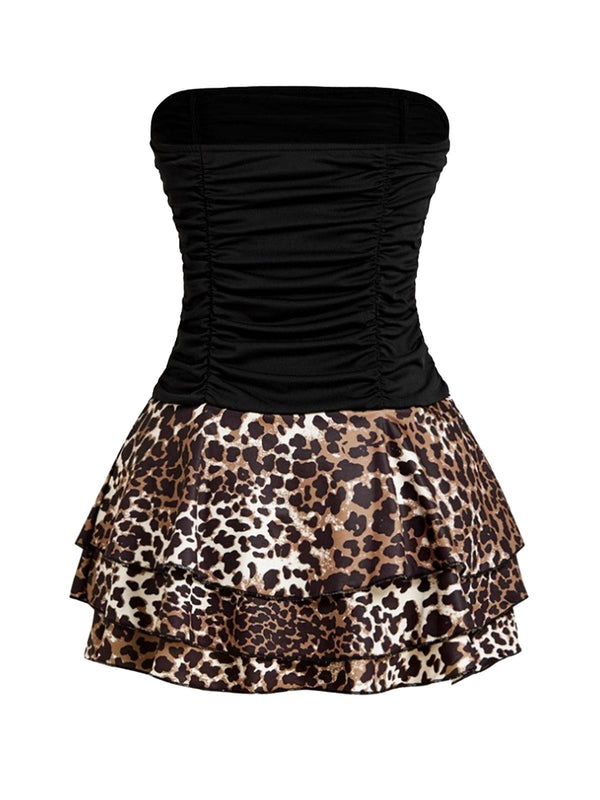 Schwarz 1980er Wickel Leopard Rüschen Binde Mini Kleid