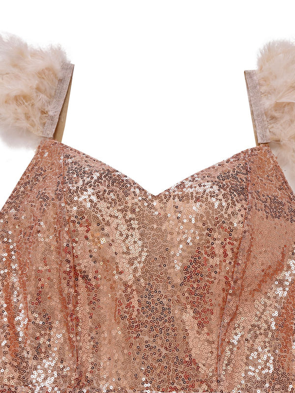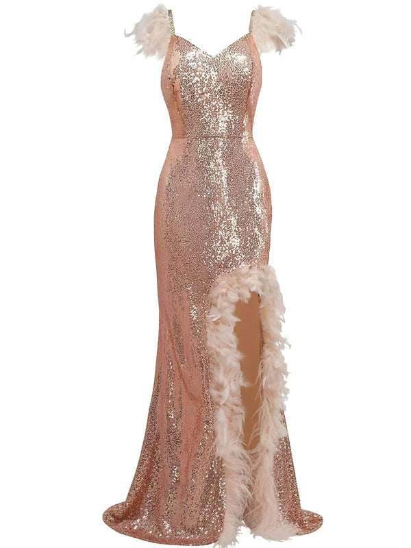 1930er V-Ausschnitt Feder Träger Hoch Schlitz Pailletten Kleid