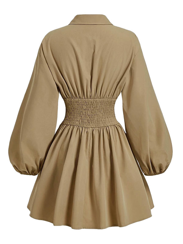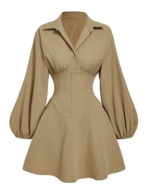 Beige 1960er Puffärmel Elastisch Geschnürt Taille Kleid