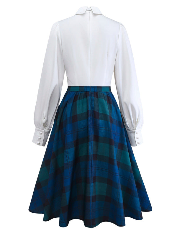 [Vorverkauf] Blau 1950er Hemd Kragen Vichy Kariert Patchwork Kleid