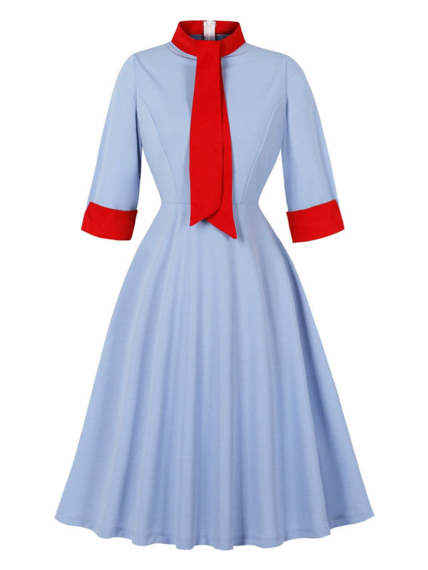 Blau 1950er Kontrast Bindehals Hoch Kragen Kleid