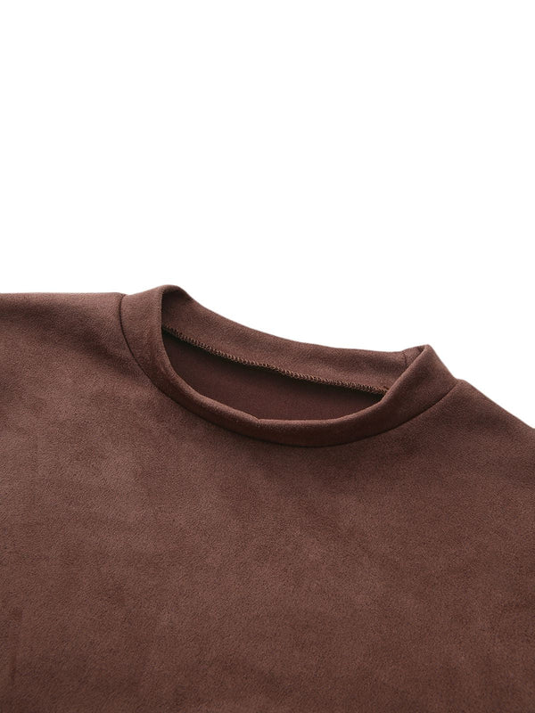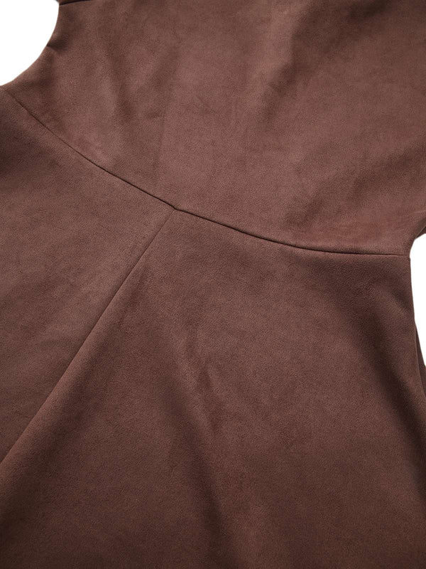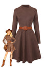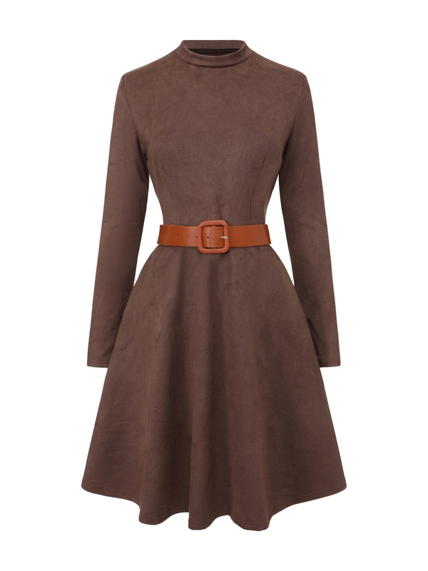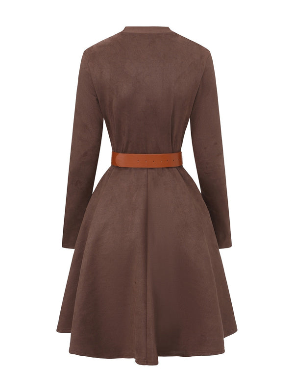 Braun 1970er Lang Ärmel Rundhals Gürtel Kleid