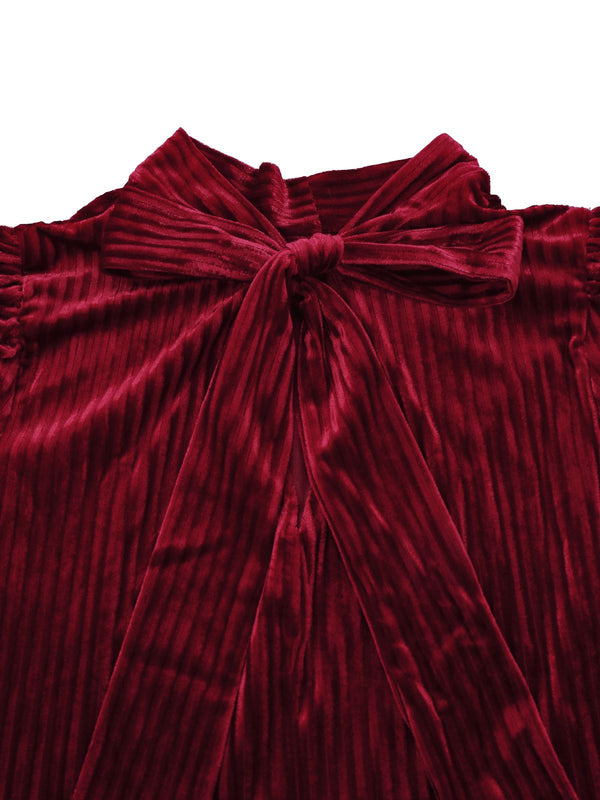 Burgunderrot 1960er Bogen Kragen Solide Samt Rüschen Kleid