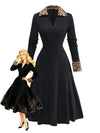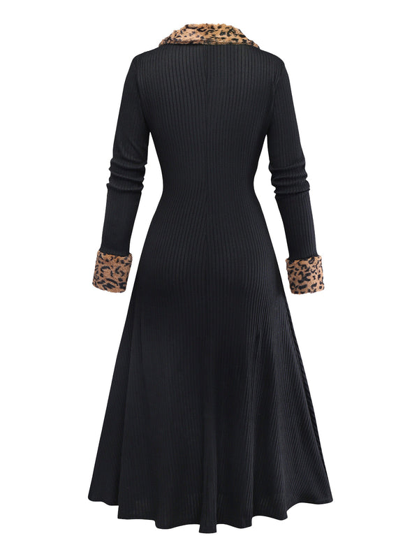 Schwarz 1940er Leopard Kunst Pelz Besatz Gerippt Stricken Kleid