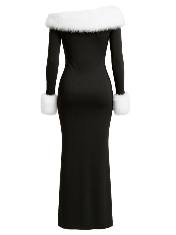 Schwarz 1980er Schulterfrei Pelz Besatz Kleid