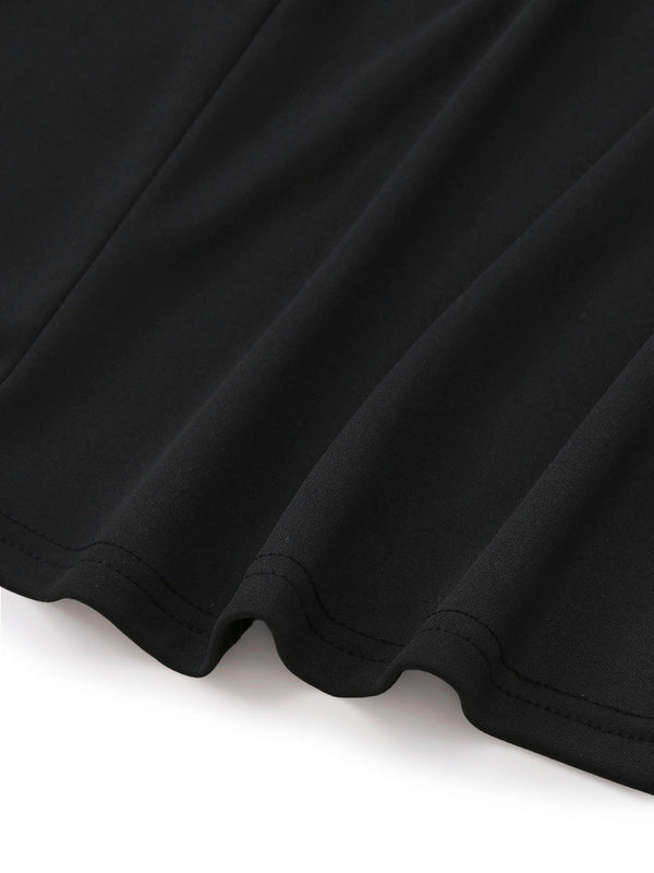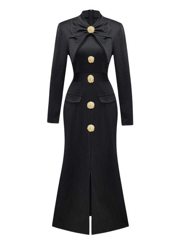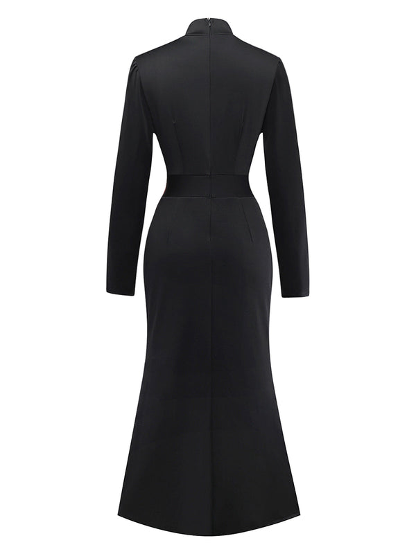 Schwarz 1930er Bogen Kragen Metall Taste Vorder Schlitz Kleid
